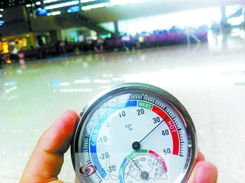 在郑州东高铁站候车大厅内,记者手中的温度计显示为33℃。